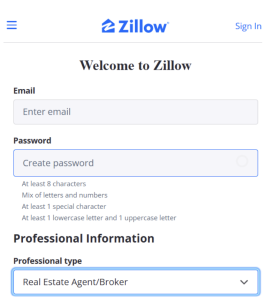 Ingresa a zillow.com, haz clic en “Iniciar sesión”, introduce tu correo electrónico, crea una contraseña y marca la opción “Soy propietario o profesional del sector”.